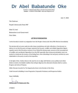 The resignation, which took effect on Thursday, July 17, 2025, was made public through a formal letter addressed to the party’s chairman in Ward 10, Boluwaduro Local Government Area, Osun State, and shared across his social media platforms.
