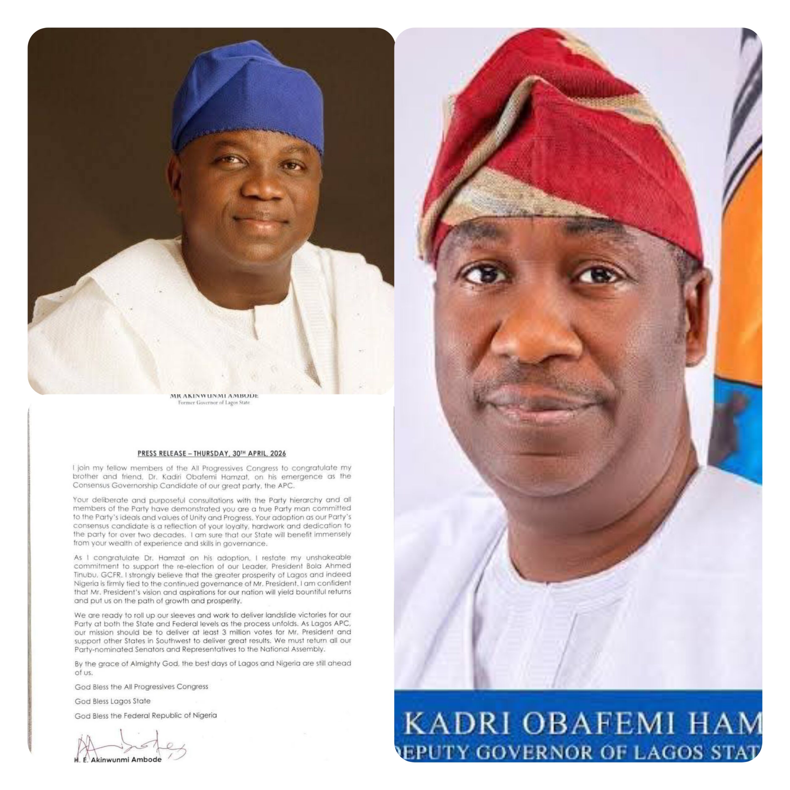 Former Lagos State Governor, Akinwunmi Ambode, has thrown his weight behind the emergence of Kadiri Obafemi Hamzat as the consensus governorship candidate of the All Progressives Congress (APC), describing the development as a testament to loyalty, dedication, and party unity.