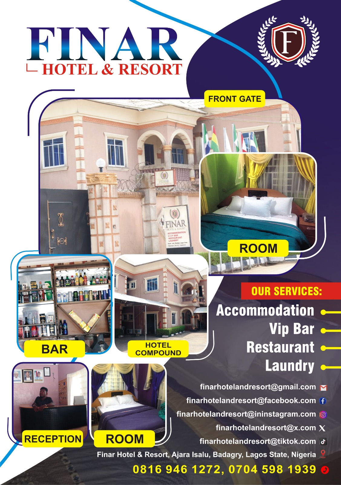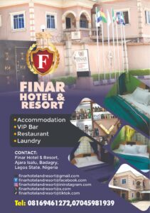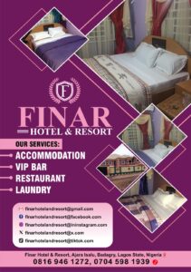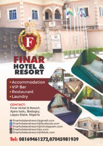 Nestled in the serene environment of Ajara Isalu, Badagry, Lagos State, FINAR Hotel & Resort stands as a perfect blend of comfort, luxury, and warm hospitality. Whether you are visiting Badagry for business, leisure, or a quiet getaway, FINAR Hotel & Resort offers an experience designed to make every moment memorable.