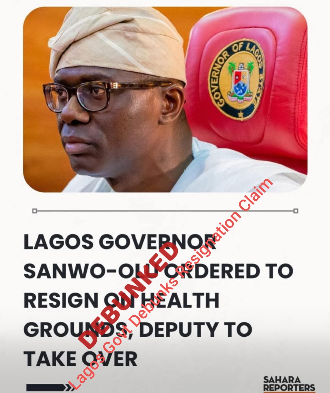 The Lagos State Government has dismissed as false a report claiming that Governor Babajide Sanwo-Olu has been asked to resign on health grounds, describing the publication as misleading and unfounded. The rebuttal follows an online story by Sahara Reporters which alleged that the governor was under pressure to step aside, with his deputy set to assume office.